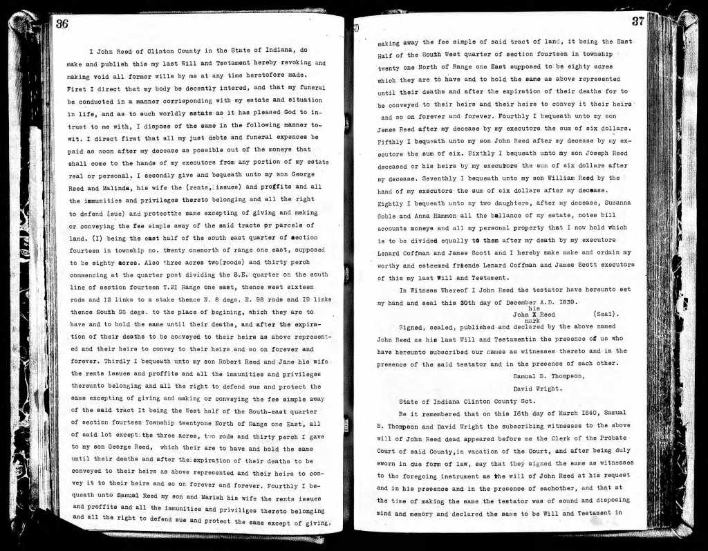 John Reed was born on January 17, 1758, in Ireland. He had seven sons and two daughters. He died on February 8, 1839, in Clinton County, Indiana, having lived a long life of 81 years, and was buried in Kirklin, Indiana.
