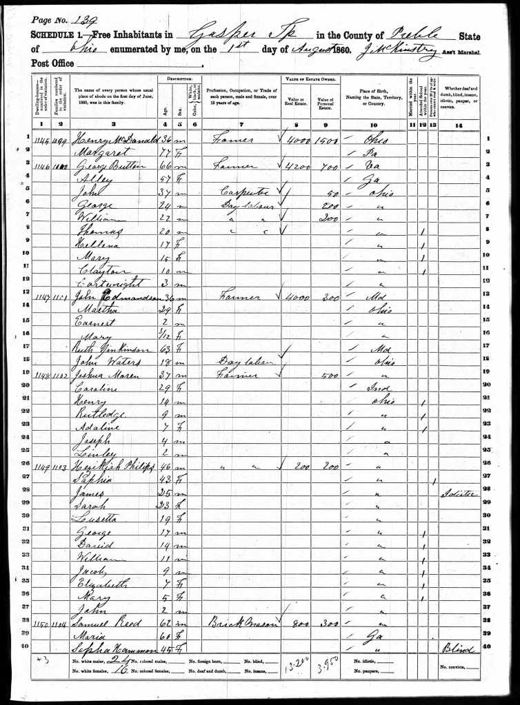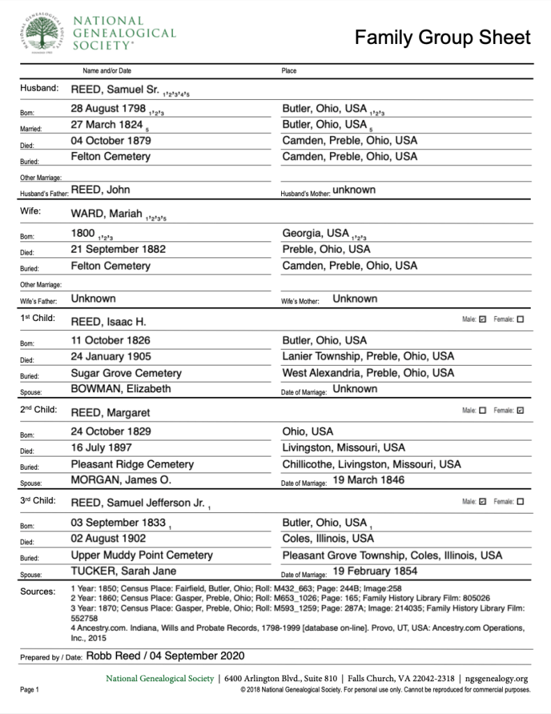 When Samuel Reed was born on August 28, 1798, his father, John, was 40. He married Mariah Ward on March 27, 1824. They had seven children in 16 years. He died on October 4, 1879, in Camden, Ohio, having lived a long time of 81 years, and was buried there.
